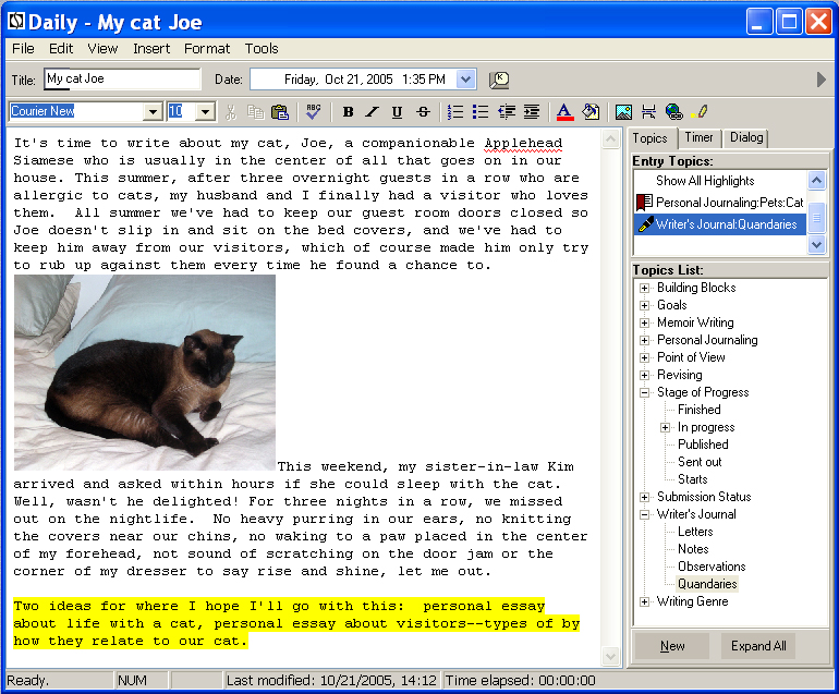 LifeJournal’s familiar word processing functions, insert and hyperlink capacity and easy organizational structure make it easy to write. Organize and store your entries in Daily, Draft, Submissions, and Life History journal entries. You can assign topics to the entire journal entry or to specific passages, so you can quickly search and review your writings. Customize the Topics List, accessible from the right side of every entry, to reflect your world. Insert pictures, or insert links to audio files, video files, websites, word docs, or any files easily. This software for writers will help you stay focused, become organized, and use your writing time efficiently!