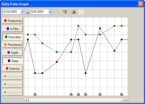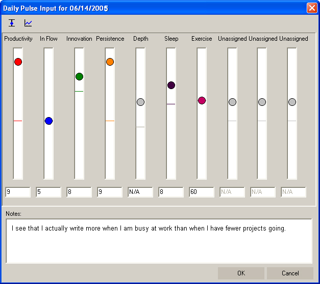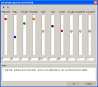 Quickly record the "pulse"of your day with interactive gauges. You can track up to ten Daily Pulse scales: subjectively rate productivity, ability to stay in flow, and objectively count the hours you wrote or read for inspiration. Then view the line graphics of your Pulse charted over time. You can display multiple Daily Pulse scales simultaneously to contrast, compare, and find correlations between one scale and another. Learn more by double clicking points on the graph to read corresponding journal entries. Unique among software for writers, you'll learn what factors are most conducive to a good writing session.