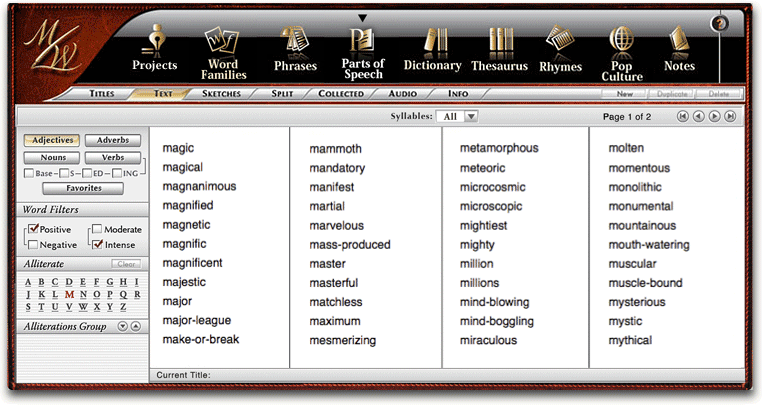 MasterWriter is an unlimited source of ideas pre-inspiration, and an invaluable tool during the creative process. However, its most important role may be post-inspiration, when finding a better way to express yourself or a more creative way to describe something, can be the difference between good and great.
