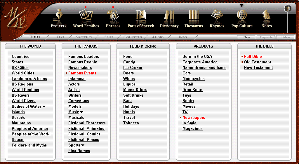 A Pop-Culture Dictionary with over 11,000 icons of American and World Culture. This section also includes the entire Bible, fully searchable and in complete context, adding to its value as a resource for spiritual writing, especially useful to clergy and other religious writers.
