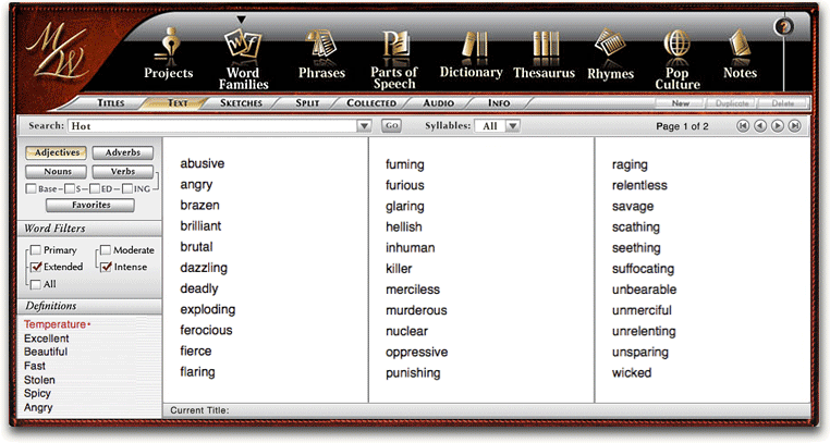 In our daily conversation and in our writing, we tend to use a vocabulary that we are familiar and comfortable with. This can be limiting and in some cases redundant, especially when there are time constraints. If you’re looking for the right word, a search in MasterWriter will instantly give you all the possibilities, and from this rich source of descriptive words, you will find new and colorful ways to paint word pictures.