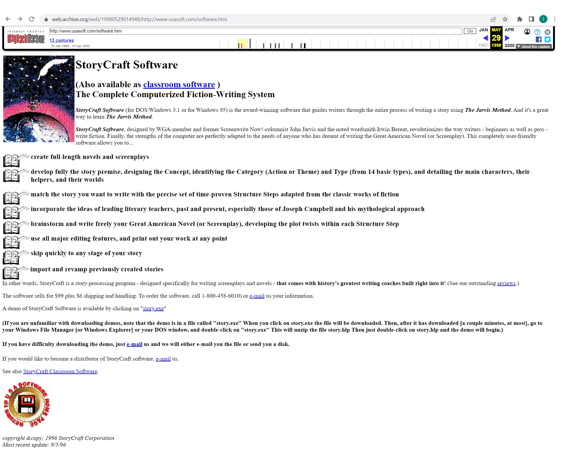 1996 Together, John and Irwin complete the design of a software program that they call “StoryCraft,” coining the phrase “story-processing” program and utilizing a system that will become known around the world to persons learning the craft of fiction as the “Jarvis Method.” They also begin selling the software in an early electronic format known as DOS. Over the years, the software has become known as StoryCraft Classic through all its various versions and incarnations — and of course DOS has long since disappeared, replaced with Windows and MAC compatibility.