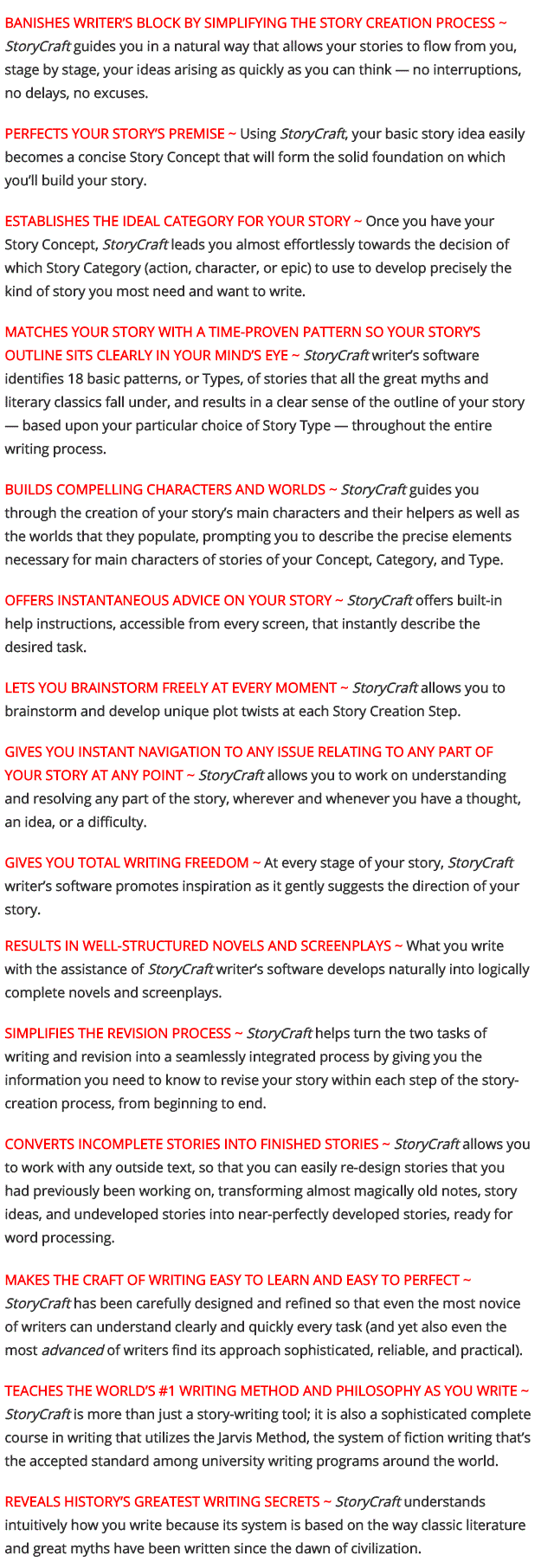 StoryCraft Classic Edition $19 – Guides you through the process of creating your story, using the Jarvis Method of story creation.  (see Features above)