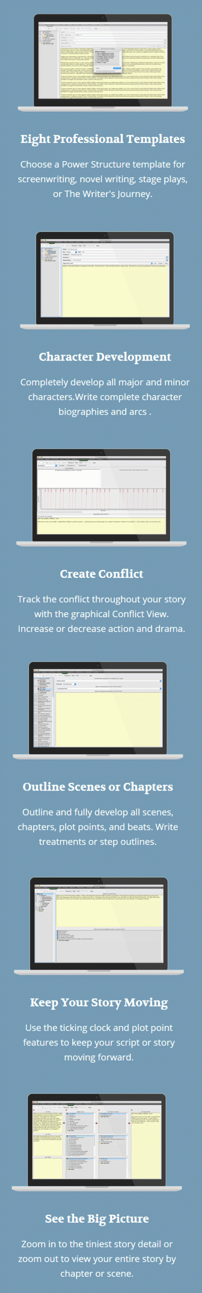 In addition to all the features of Classic StoryCraft as well as the Luxury Edition of StoryCraft Software, the Ultimate Edition of StoryCraft has a complete set of story-line templates, our “Power Structure” enhancements described below.